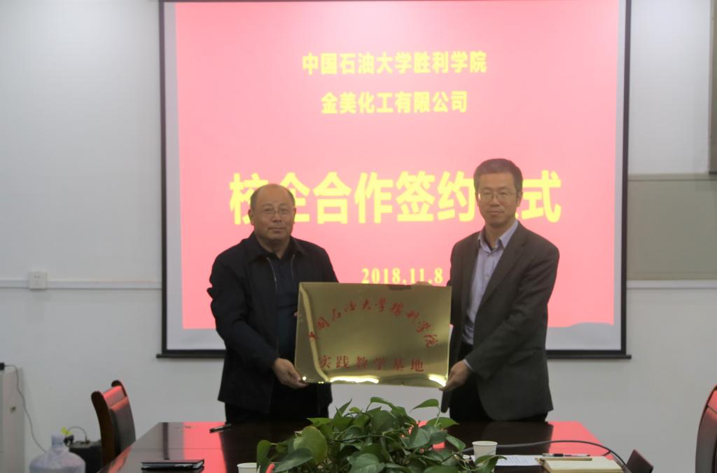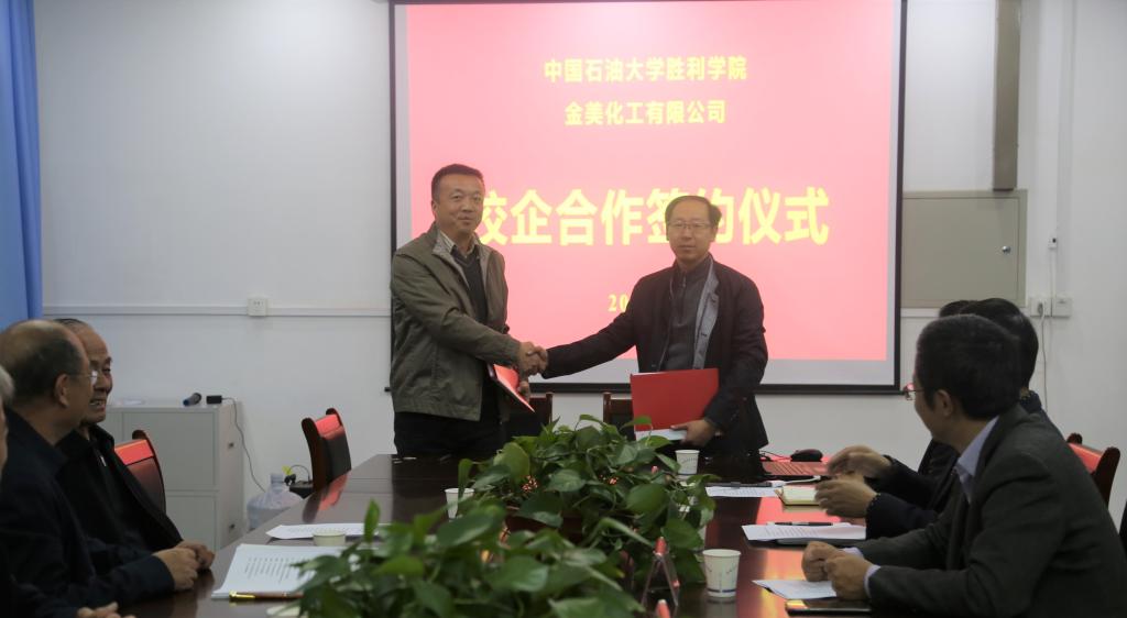 2018年11月9日下午,金美化工有限公司与与中国石油大学胜利学院yl7703永利集团校企合作签约暨联合研发中心揭牌仪式在石大化工楼正式举行。中国石油大学胜利学院副院长赫正、教学科研处处长杨树林、yl7703永利集团执行院长吴明银、副院长于颖敏、副院长史德青,金美化工董事长王学会、研发中心主任周西臣、总经理纪洪涛、高级工程师周奎三共同出席此次仪式。赫正与王学会共同为“yl7703永利集团-金美化工有限公司联合研发中心”揭牌。