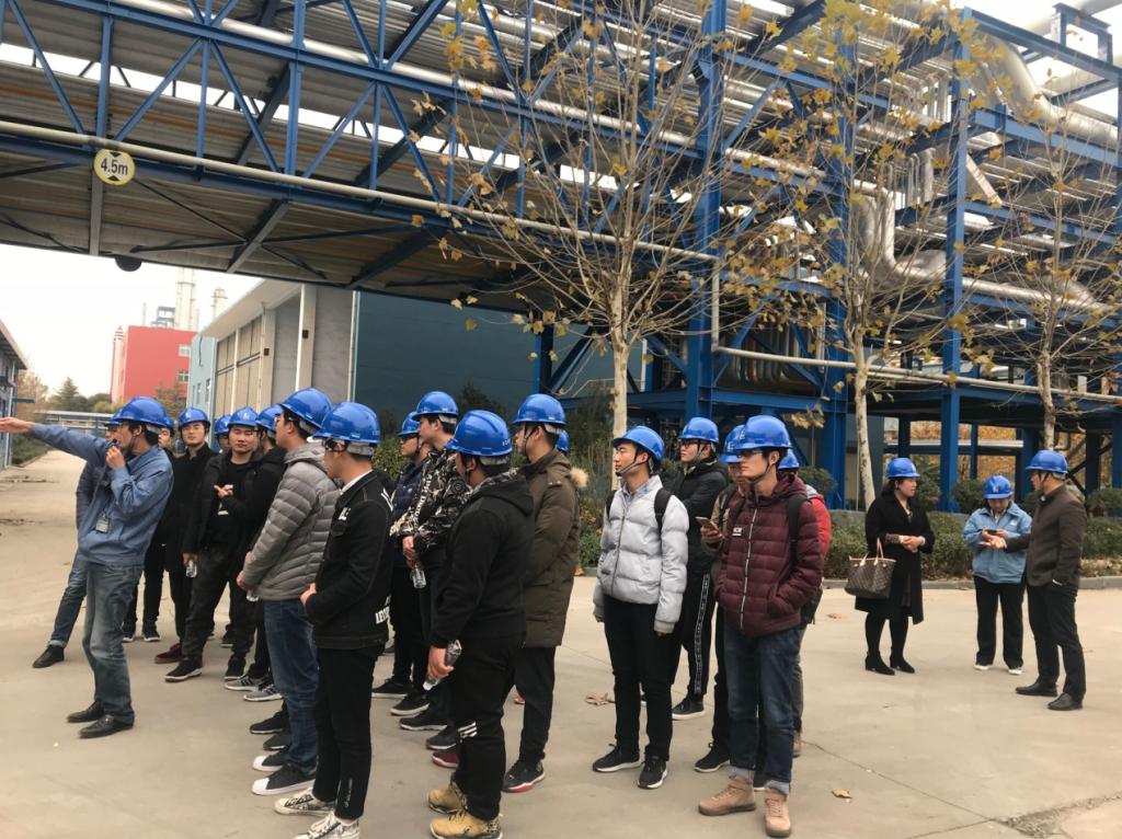 中午稍作休整后,在解说员的带领下,我校师生代表一行走进工厂,依次参观了生产车间中控室、生产回收装置、罐区等主要操作装置以及基本设施。在解说员的详细讲解下,学生对企业生产流程、产品、生产模式等方面有了更深一层的了解。