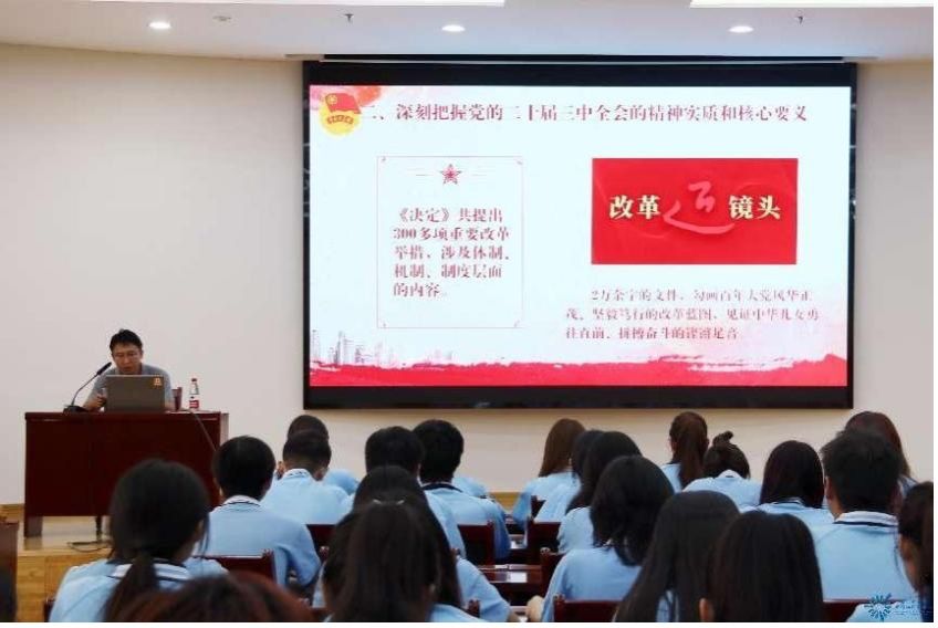 会议上,王子松老师强调了党的二十届三中全会的重大意义,指出本届全会是在以中国式现代化全面推进强国建设、民族复兴伟业的关键时期举行的一次十分重要的会议,具有历史、理论和现实的重要意义,活动现场播放《介绍和解读党的二十届三中全会精神》《引领新时代改革开放》等视频,让同学们更加直观地感受和领悟全会精神,他提倡通过开展校园活动,主题研讨和辩论,在实践中深入企业和社区,以实践行动为祖国繁荣富强增砖添瓦,最后,王子松老师鼓励广大青年学生坚定听党话、跟党走的政治信念,自己的命运同国家民族的命运紧紧联系在一起、把人生理想融入国家和民族的事业中,争做有理想、敢担当、能吃苦、肯奋斗的新时代好青年。