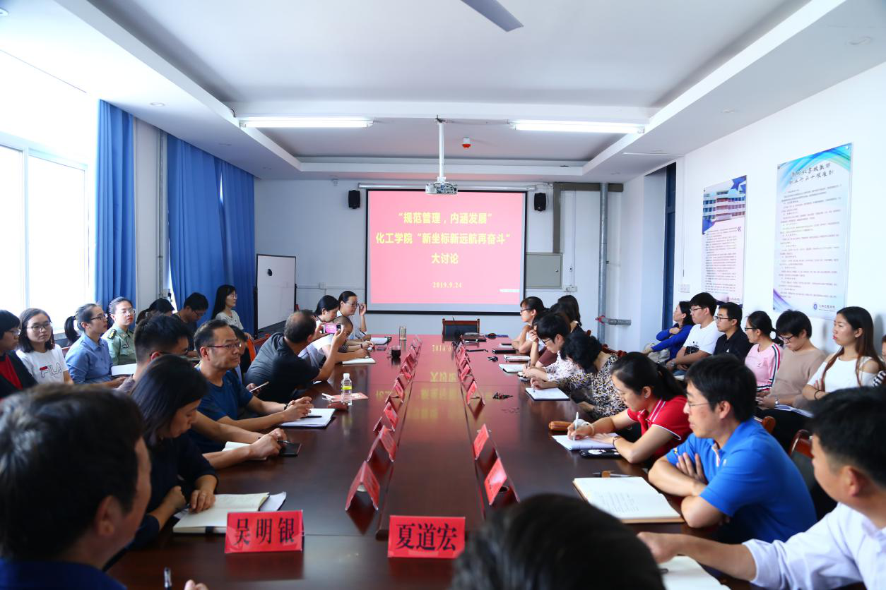2019年9月25日下午,yl7703永利集团在化工楼二楼会议室举行了“规范管理,内涵发展”暨化工学院“新坐标新远航再奋斗”大讨论会议,学院领导及全体教师参加了此次会议。会议由执行院长吴明银主持。