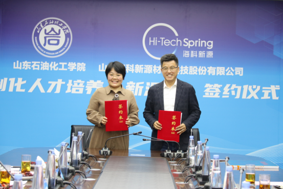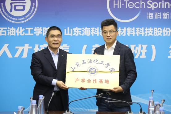 2022年5月11日上午,我校与山东海科新源材料科技股份有限公司定制化人才培养(新源班)暨产学合作基地签约仪式在海科大厦举行。教务处处长杜彩凤,我院党总支书记祝永胜,副院长张春晓、史德青,海科集团副总裁缪初晓,海科新源公司总经理张生安、副总经理杨献峰等相关公司人员以及教师代表出席签约仪式。仪式由杨献峰主持。