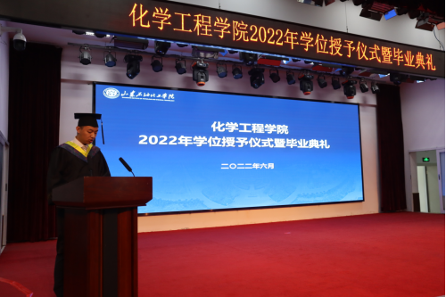 优秀学生代表许迪发言,他回顾了大学四年的努力和所取得的成绩,对母校的栽培深怀感激。他还表示,作为毕业生今后不管身在何处,都会怀揣一份对生活的热爱,厚植爱党爱国爱校情怀,传承化院精神,在各自的领域发光发热。