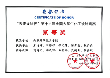 近日,第十六届全国大学生化工设计竞赛落下帷幕,由化工学院学生王运坤、刘静程、张文慧、陈保童、张云云(指导老师:刘博文、李成帅、石会龙、史德青、张会敏)组成的“醇开心”团队荣获“全国二等奖”。