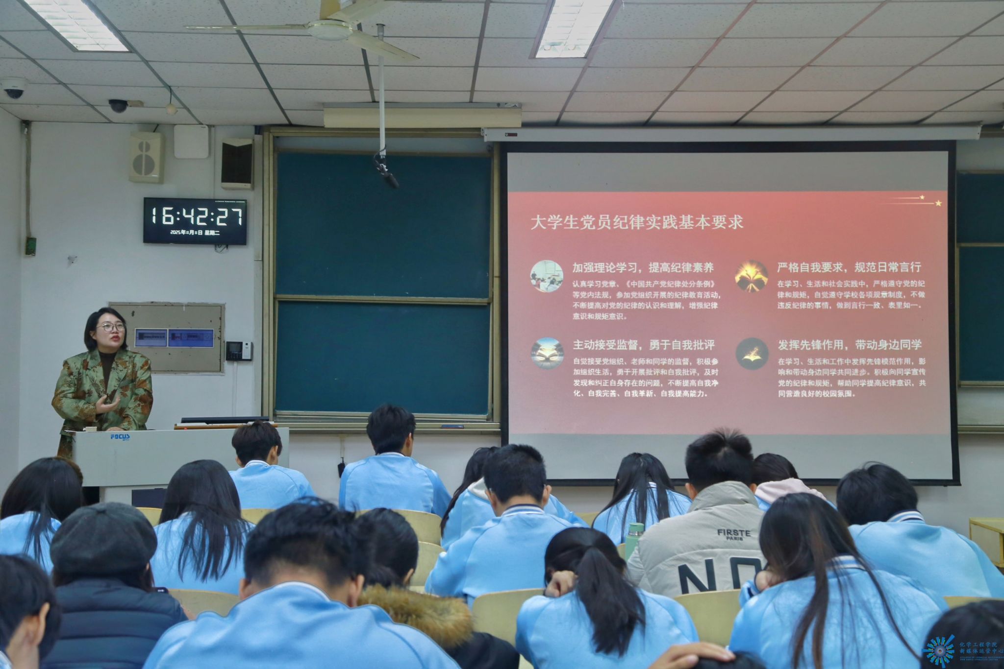 苏老师围绕“强化纪律观念,筑牢思想根基”这一核心,系统阐述了入党积极分子在多个层面应当恪守的纪律要求,并对全体入党积极分子提出明确的纪律要求与努力方向:加强理论学习、提高纪律素养、勇于自我批评、发挥先锋作用。不仅自身要成为遵规守纪的模范,还要积极影响和带动周围同学共同进步,营造风清气正、积极向上的校园氛围。