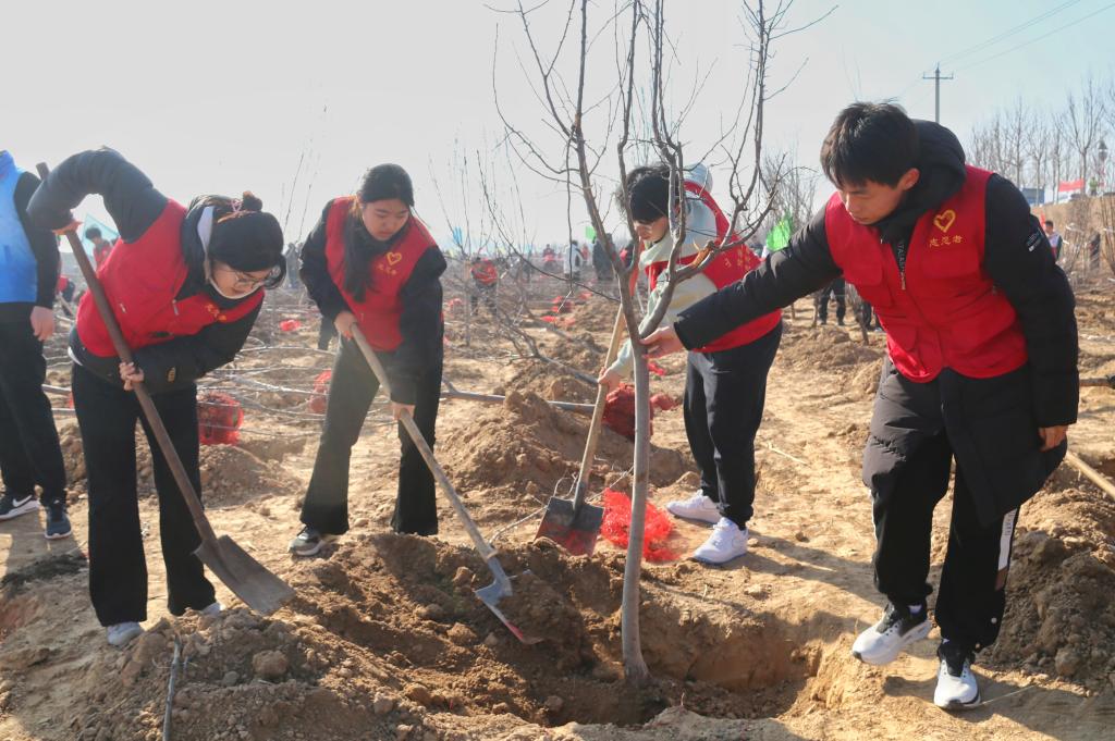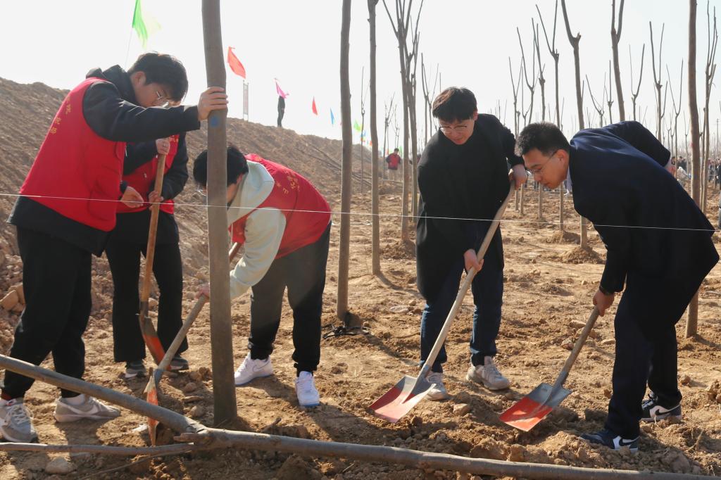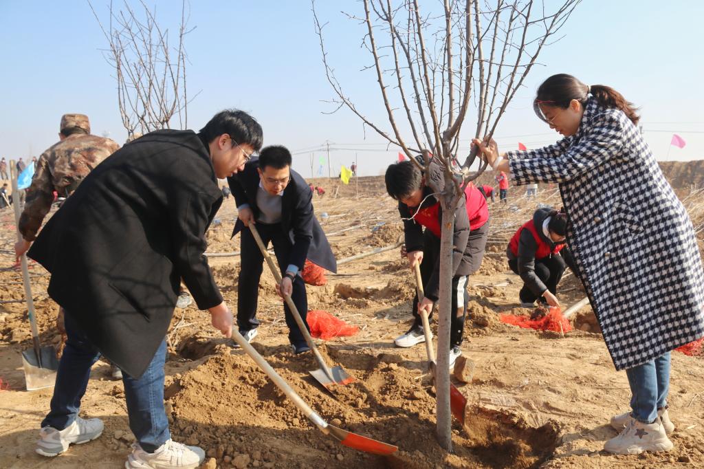 在活动现场,大家热情高涨,挥锹铲土、扶苗围堰、提水浇灌,干劲十足,经过一上午的辛勤忙碌,树苗整整齐齐地矗立在滩区周围。春风过处,一颗颗新栽种的苗木错落有致、迎风挺立,为初春增添了勃勃生机。