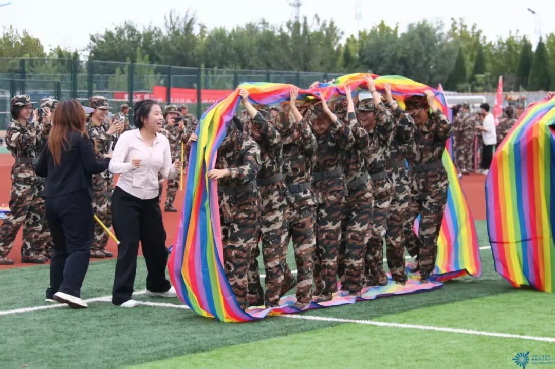 “解结破冰”这一热身环节在轻松愉悦的氛围中,拉开了活动的帷幕,“大风吹”游戏中,同学们在人群中寻找符合要求的伙伴,目光里满是急切与专注,跑动声、笑声、呼喊声交织在一起,让新生们在短时间内熟悉彼此,有效拉近了心理距离。“不倒森林”进行时,大家全神贯注盯着手中的立杆,随着节奏移动脚步,不仅考验着同学们的耐心,更提升了同学们的团队协作能力。“车轮滚滚”环节里,各小组同学团结协作,讨论策略,首位同学把控着前进节奏,同学们脚步整齐划一,快速完成了“车轮”推进的任务。“动力圈”环节,同学们手拉手围成巨大圆圈,随着口令一同摇动绳索,大家齐声呼喊着口号,声音铿锵有力,与绳索摇动的节奏相互呼应,每一位同学都热血沸腾。最后的分享交流环节,各连队教官及新生助理分享活动感受,新同学们也积极发言,分享自己参与活动的心得与收获。