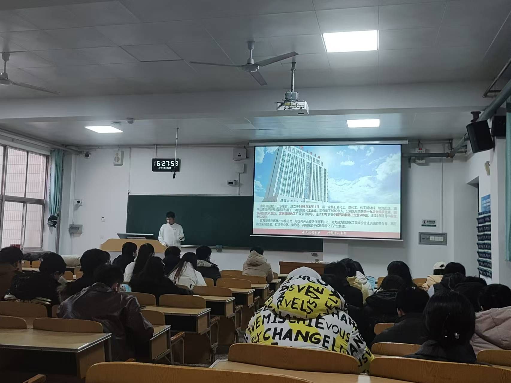 公司人力资源部招聘经理徐浩强先生播放公司宣传片展现了企业的发展历程和前景,讲述了企业的先进技术、卓越管理和创新理念,同学们直观地感受到了企业的实力和影响力。