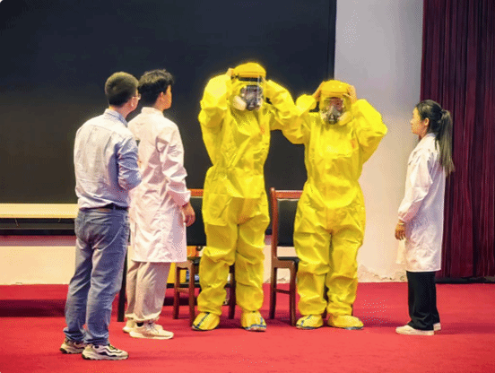 在随后的实验室浓硫酸泄漏事故应急演练中,学生们迅速响应,按照实验室安全事故的应急处置流程有条不紊地进行着应急处理。一部分学生迅速启动紧急冲洗装置,对可能受到污染的皮肤和眼睛进行初步冲洗;另一部分学生则负责疏散周围人员,并向相关单位报告事故情况,请求专业救援。整个演练过程紧张而有序,环节衔接流畅,部门配合默契,确保了应急响应的迅速与高效。