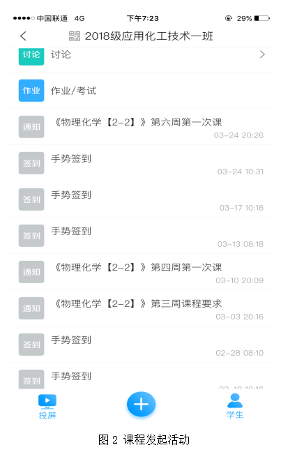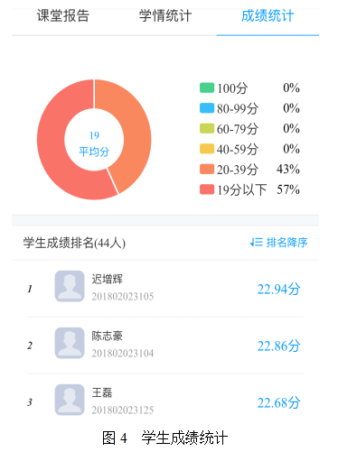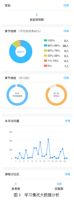 超星尔雅教学平台包括学生和教师两个客户端。教师创建课程,包括在课程中进行微课视频、ppt和教案的上传及管理(图1);组织活动(签到、测评、作业发布、话题、选人、发布通知等)(图2);对各个学生的学习情况进行大数据分析(图3);学生加入课程,参与并完成课程任务,获得积分(图4)。学生可以随时随地利用各种“零碎”时间进行学习,学生学习的积极性大大提高。