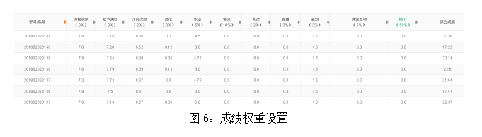 课程建设的第一步是要进行成绩权重的设置,并告知学生,学生可以随时关注自己的平时成绩,激发学生学习的积极主动性。本课程成绩权重设置如图6:
