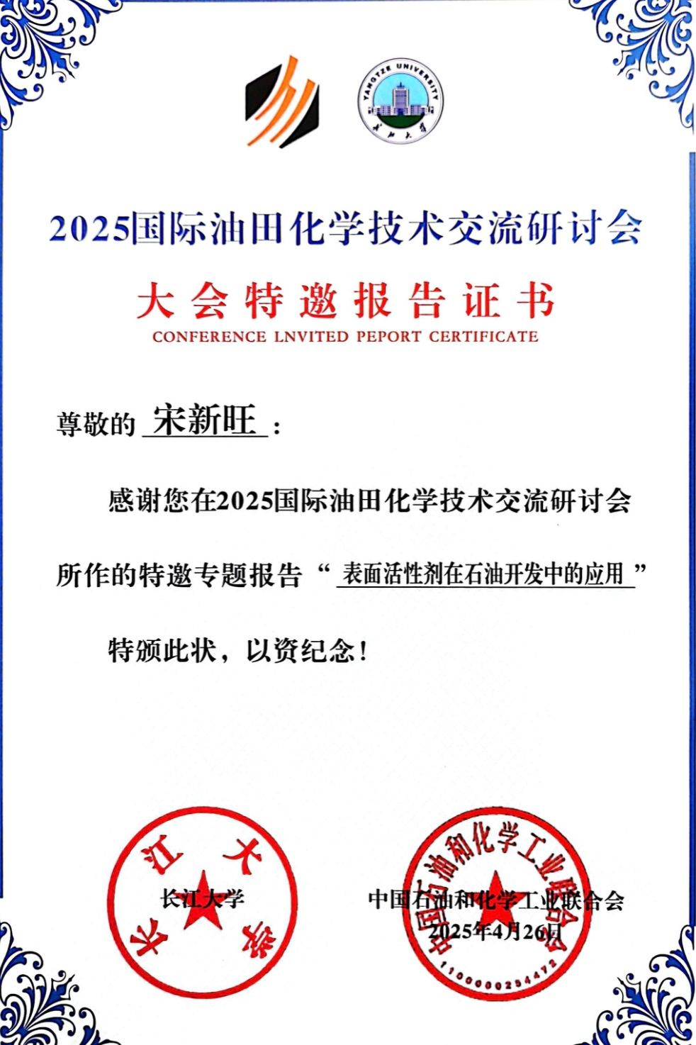 2025年4月26-27日,yl7703永利集团宋新旺教授参加了由中国石油和化学工业联合会和长江大学主办的“2025国际油田化学技术交流研讨会”,并作特邀专题报告“表面活性剂在石油开采中的应用”,介绍了我院在采油用表面活性剂方向的最新研究成果,受到与会人员的高度关注。