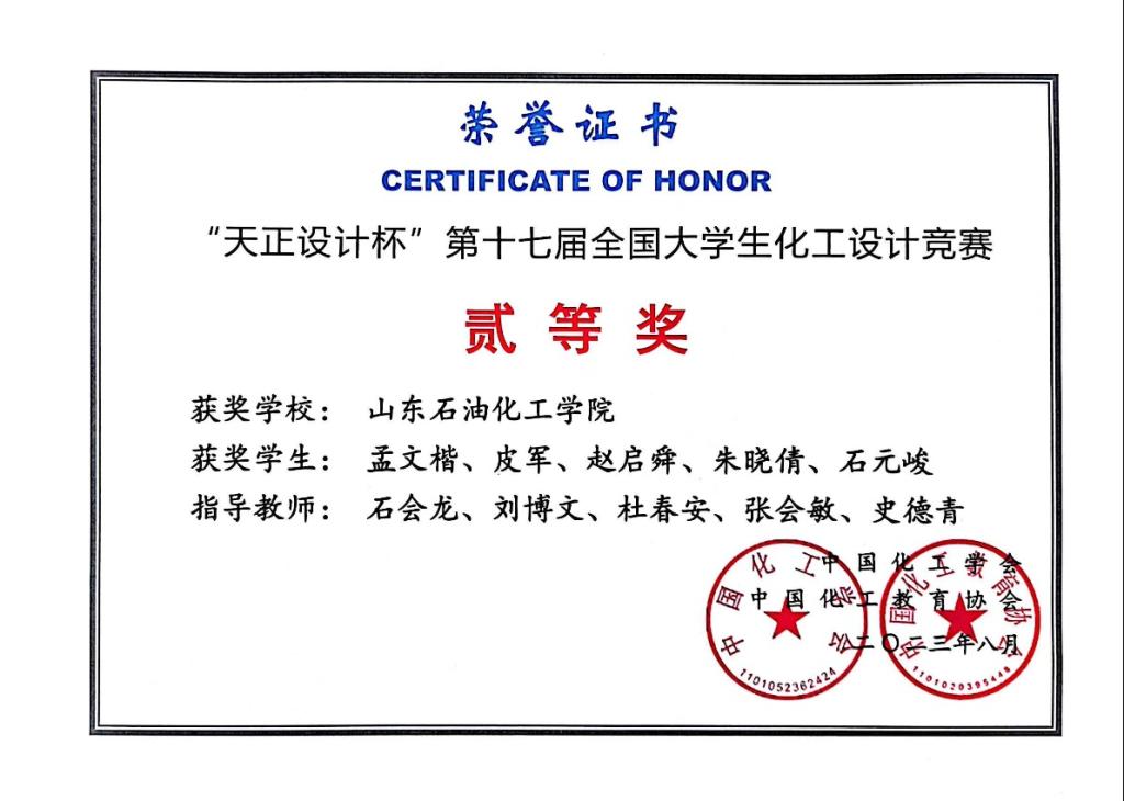 我院学生孟文楷、皮军、赵启舜、朱晓倩、石元峻(指导老师:石会龙、刘博文、杜春安、史德青、张会敏)的工艺设计《重庆紫光国际化工有限公司年产十三万吨己二腈项目》荣获全国二等奖。